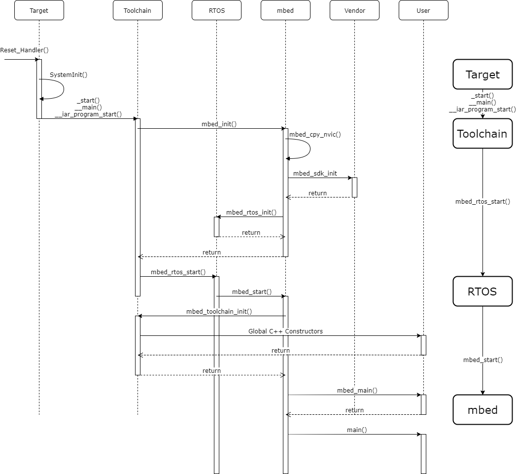 When execution reaches the entry points, you can expect a fully initialized system that is ready to execute application code. The Mbed OS boot sequence consists of four phases: target setup, toolchain setup, starting the RTOS and starting the Mbed application. You can see these phases below: